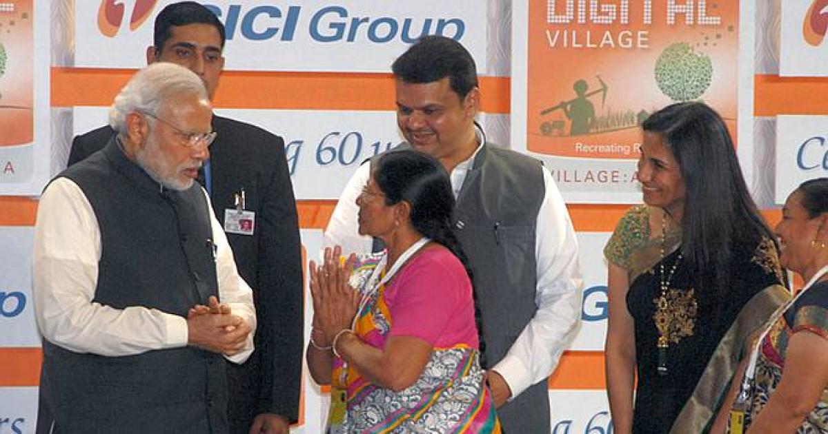 To Modi's left is Maharashtra Chief Minister Devendra Fadnavis and ICICI Bank MD and CEO Chanda Kochhar.