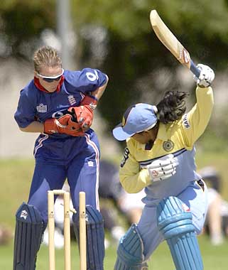 Indian batswoman Mamtha Maben looks behind to see the stumps shattered as wicketkeeper Godliman watches.