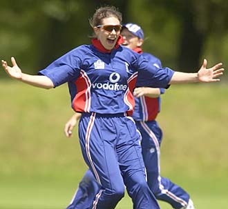 Off-spinner Laura Harper rejoices after claiming the wicket of Hemlata Kala, caught and bowled. Harper finished with four wickets for 11 runs.