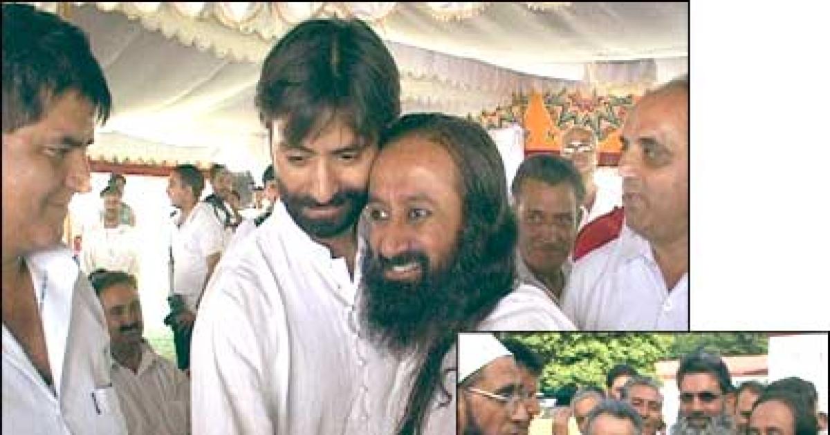 Sri Sri Ravi Shankar embraces Jammu and Kashmir Liberation Front chief Yaseen Malik on the sidelines of a conference on human values in Srinagar on Monday.