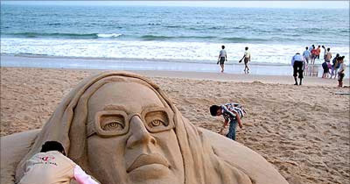 Sand artist Sudarsan Pattnaik gives the finishing touches to a sand sculpture of former Pakistani prime minister Benazir Bhutto on a beach in Puri, around 100kms east of Bhubaneswar.