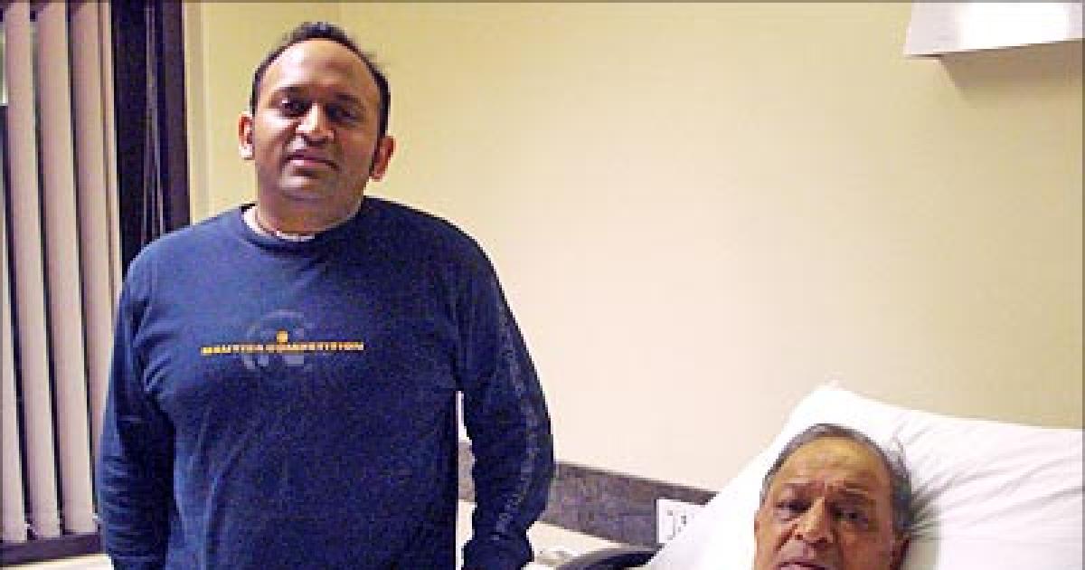 Image: Deepak Kuntawala with his father Vinay, who is recuperating at Bombay Hospital. Photograph: Matthew Schneeberger.