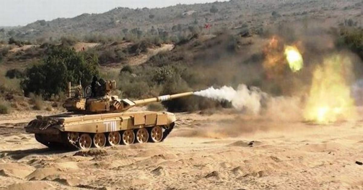 IMAGE: Indian Army tanks fire at 'enemy bunkers' during Operation Shatrujeet, a military exercise in the deserts of Rajasthan, April 2016.