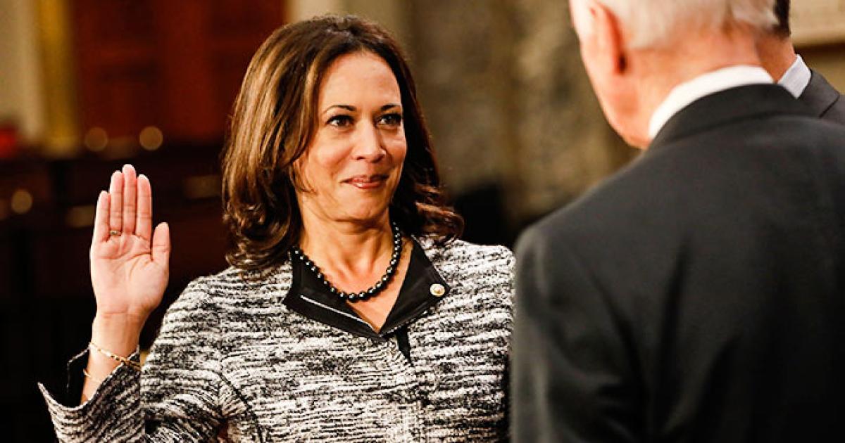 Kamala Harris, a Democrat from California and attorney general of the state before this, in a re-enacted swearing in with US Vice-President Joe Biden in the Old Senate Chamber at the US Capitol, Washington, DC, January 3, 2017.