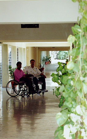 The wide corridor allows three wheelchairs          to pass comfortably